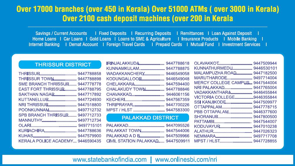 Over 17000 Branches (Over 450 in Kerala) Over 51000 ATM's (Over 3000 in Kerala). Over 2100 cash Deposit Machines (Over 200 In Kerala)